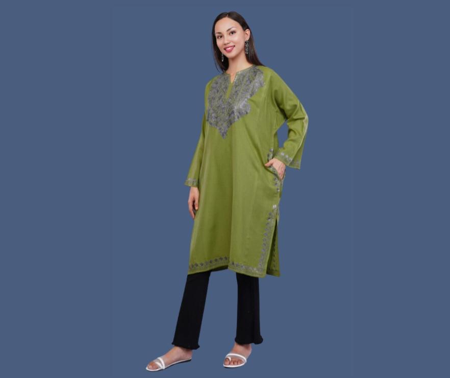 Elegant and warm, this Maroon Fine Cashmilon Pheran with Blue Floral Aari Embroidery Embroidery around the neckline. Designed for comfort with two side pockets, it’s a timeless winter essential.