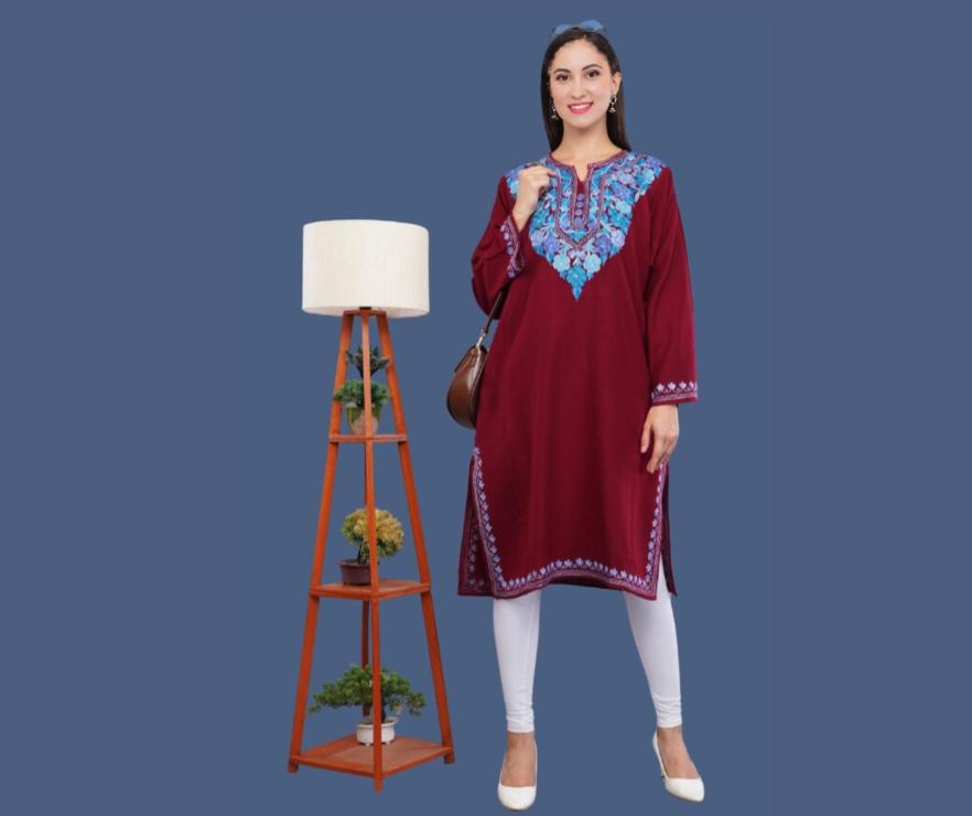 Elegant and warm, this Maroon Fine Cashmilon Pheran with Blue Floral Aari Embroidery Embroidery around the neckline. Designed for comfort with two side pockets, it’s a timeless winter essential.