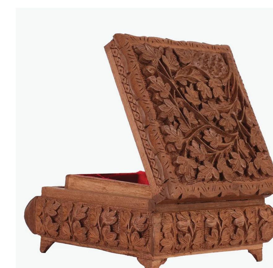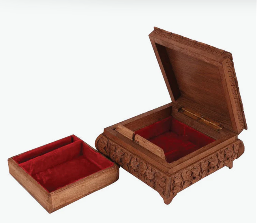 This exquisite walnut wood storage box, adorned with the iconic Chinar leaf motif, combines tradition with utility. Featuring dual top compartments and a velvet-lined interior, it’s perfect for storing jewelry, keepsakes, or valuables. A secure side latch ensures contents stay protected.